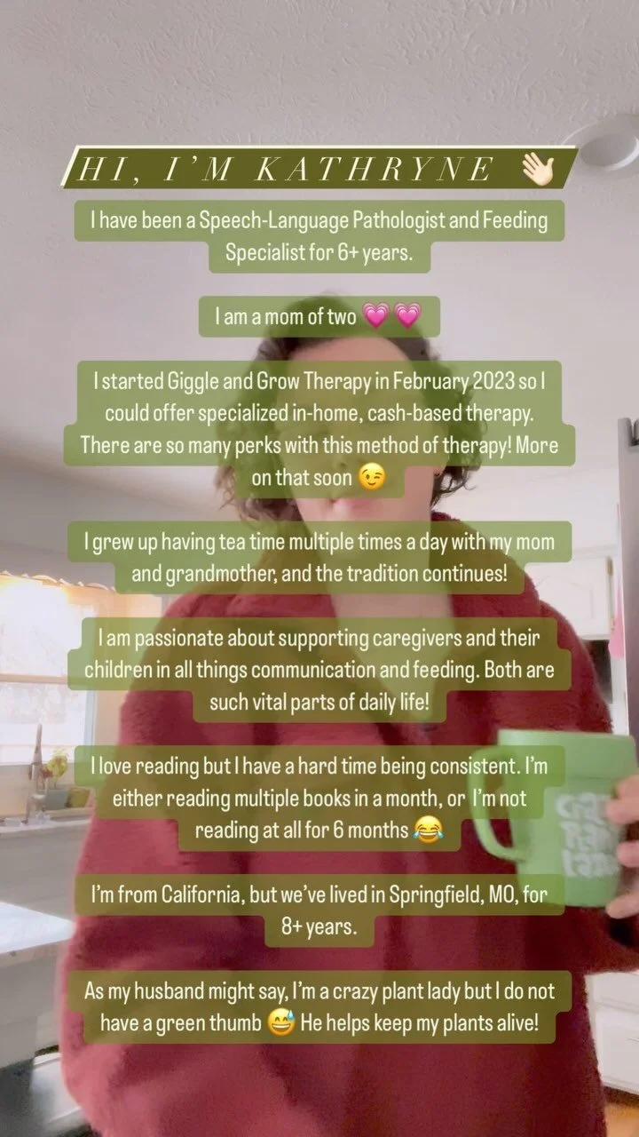 Hi, I’m Kathryne! A Speech-Language Pathologist, pediatric feeding specialist, and mom to two littles. I earned my master’s degree in Speech-Language Pathology in 2017 from Missouri State University. I began my career with early intervention services in the home health setting, while also serving students with severe disabilities in the state school setting. I enjoy working closely with families and other specialists to provide therapy and coaching to support your child right where they are, then use evidence-based methods to build up their skills.